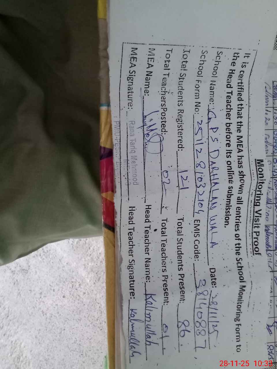 | Attendance Register | Head Teacher | MEA with School | Visit Proof |