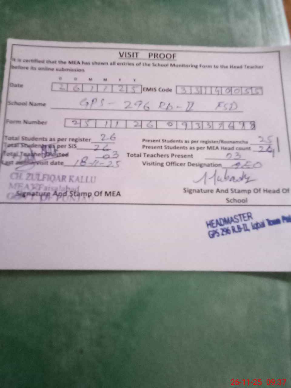 | Remarks (Use Separate Page if Required): said school have only 26 student and have 03 teachers more over said school have no electricity . other facility satisfactory. | |||||