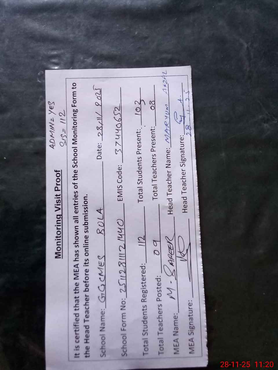 | Attendance Register | Head Teacher | MEA with School | Visit Proof |