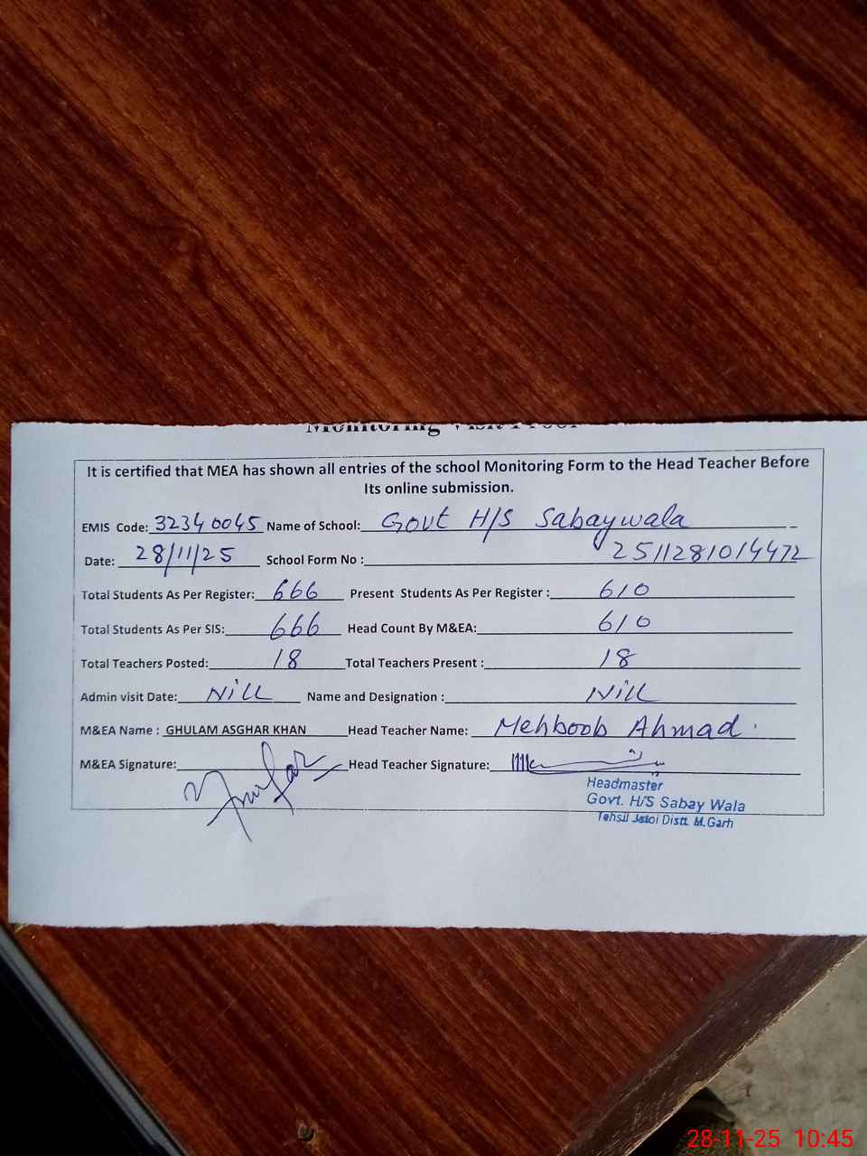 | Attendance Register | Head Teacher | MEA with School | Visit Proof |