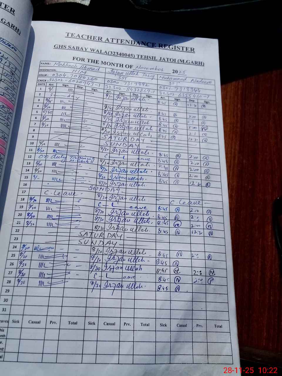 | Name: IR**** UL**** TA**** Designation: (School Headmaster's/Headmistress's) S.S.T.(GEN) Phone/Cell Number: 03**** |
