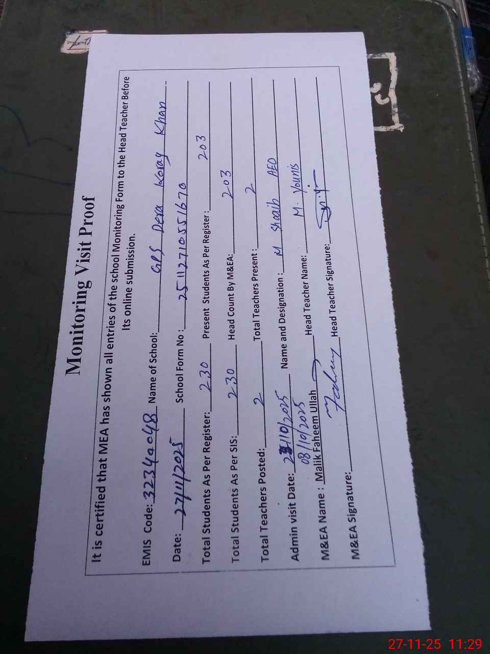 | EMIS Code: 32340048 | Name of School: GPS DERA KORAY KHAN | |||