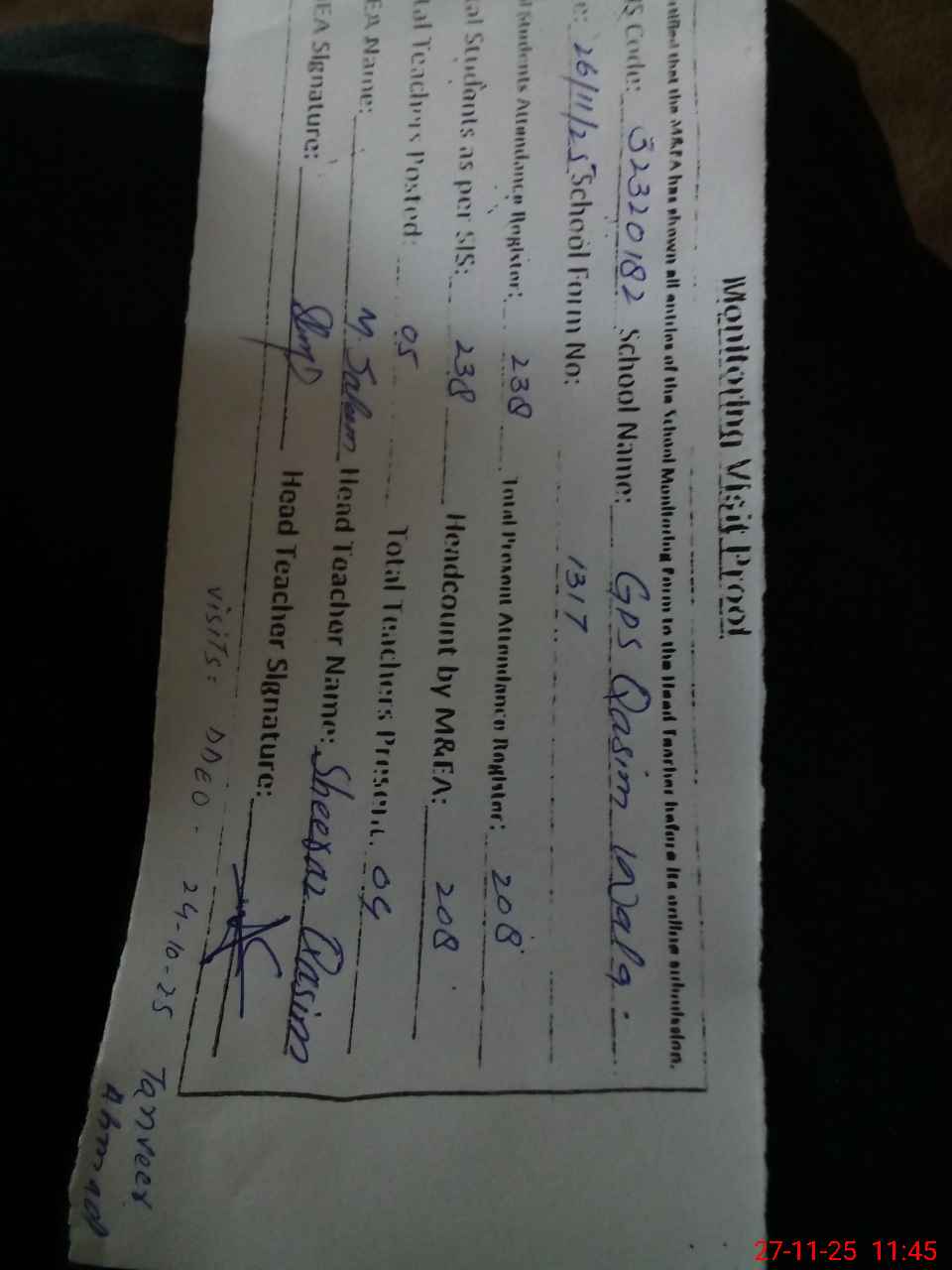 | Attendance Register | Head Teacher | MEA with School | Visit Proof |