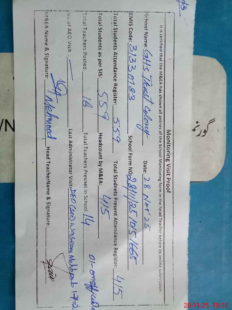 | Attendance Register | Head Teacher | MEA with School | Visit Proof |