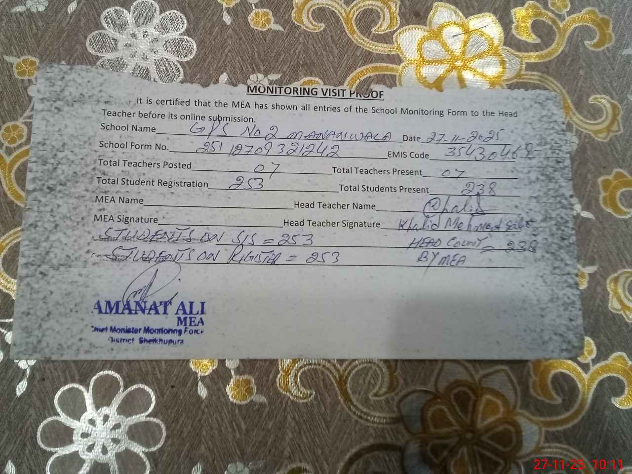 | Attendance Register | Head Teacher | MEA with School | Visit Proof |