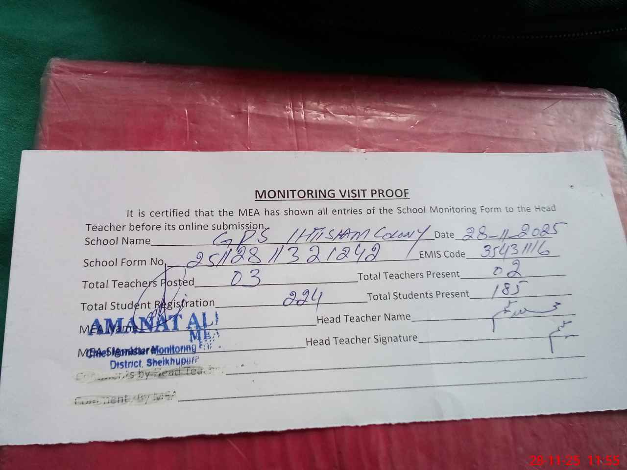 | Attendance Register | Head Teacher | MEA with School | Visit Proof |