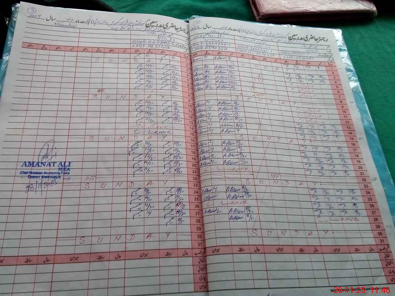 | CNIC | Full Name | Designation | R/C | Absence During Last Calender Month |