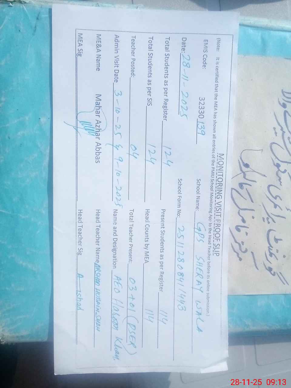 | Attendance Register | Head Teacher | MEA with School | Visit Proof |