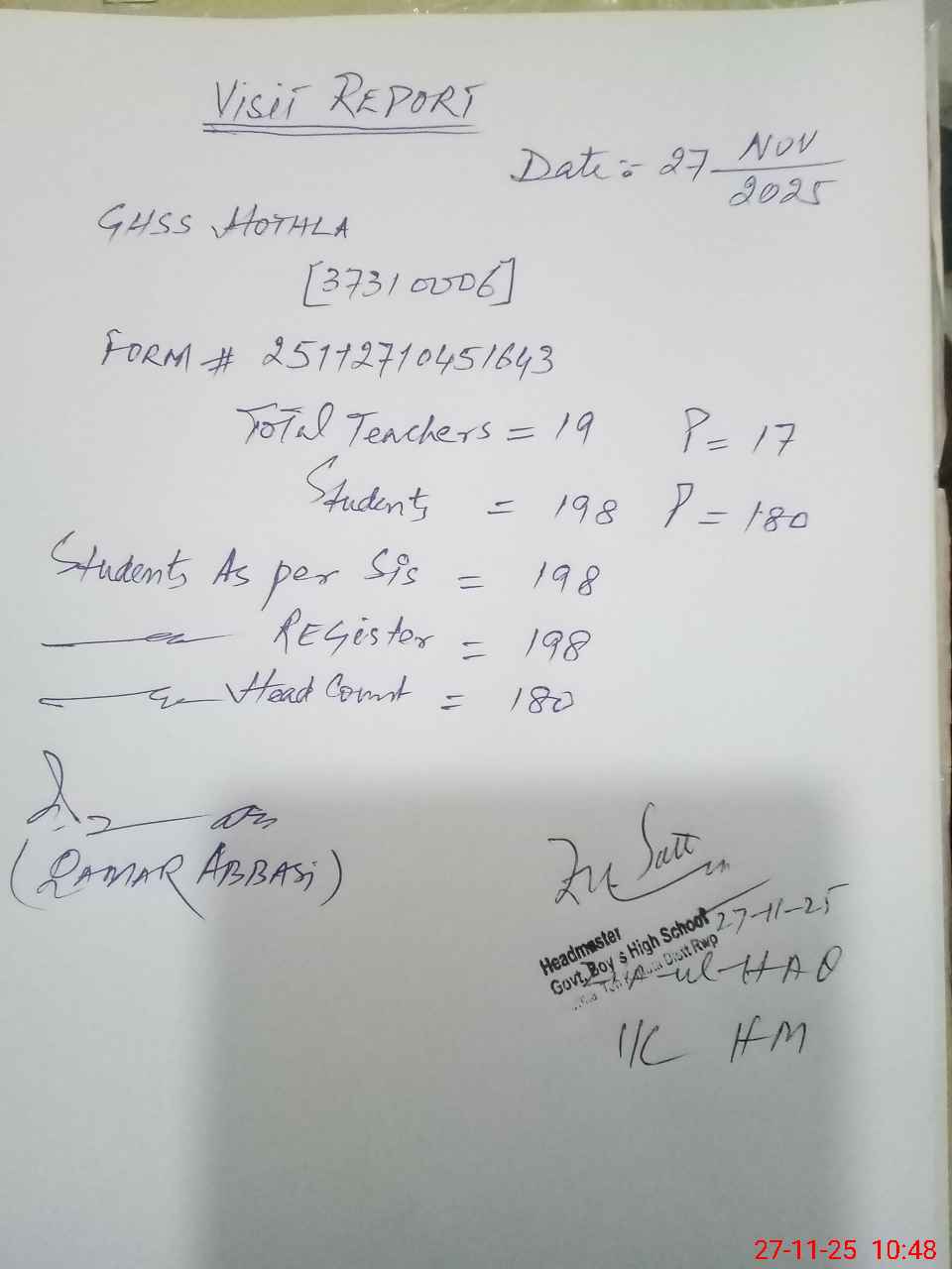 | Name: ZI**** ULHA**** Designation: (School Headmaster's/Headmistress's) IC HEADMASTER Phone/Cell Number: 03**** |