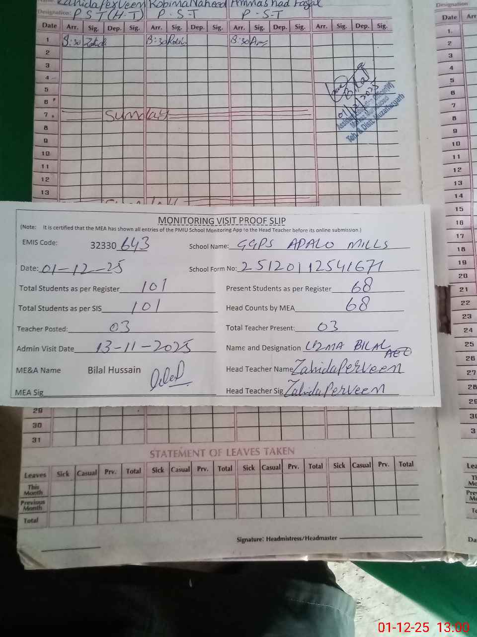 | Attendance Register | Head Teacher | MEA with School | Visit Proof |