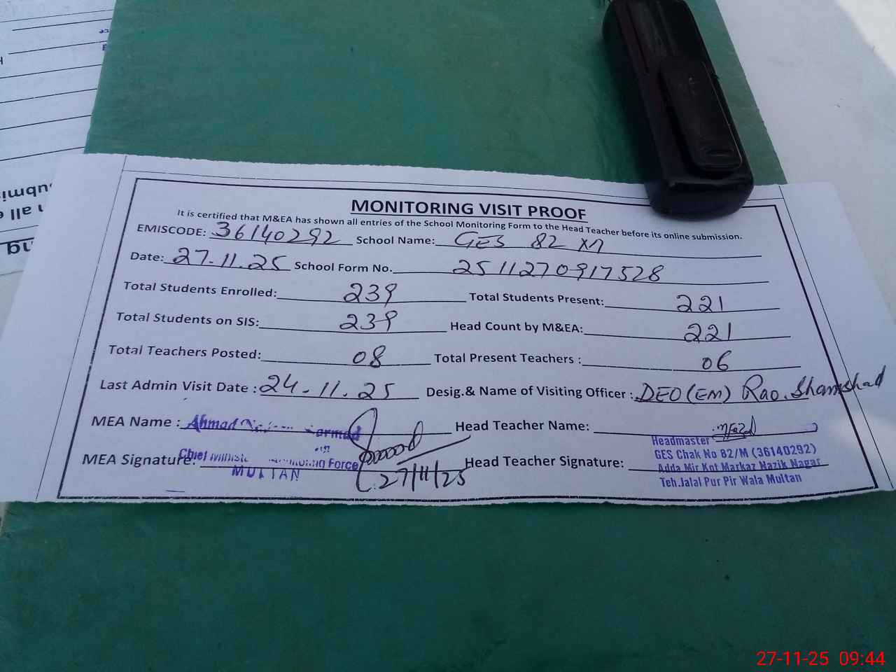 | Attendance Register | Head Teacher | MEA with School | Visit Proof |