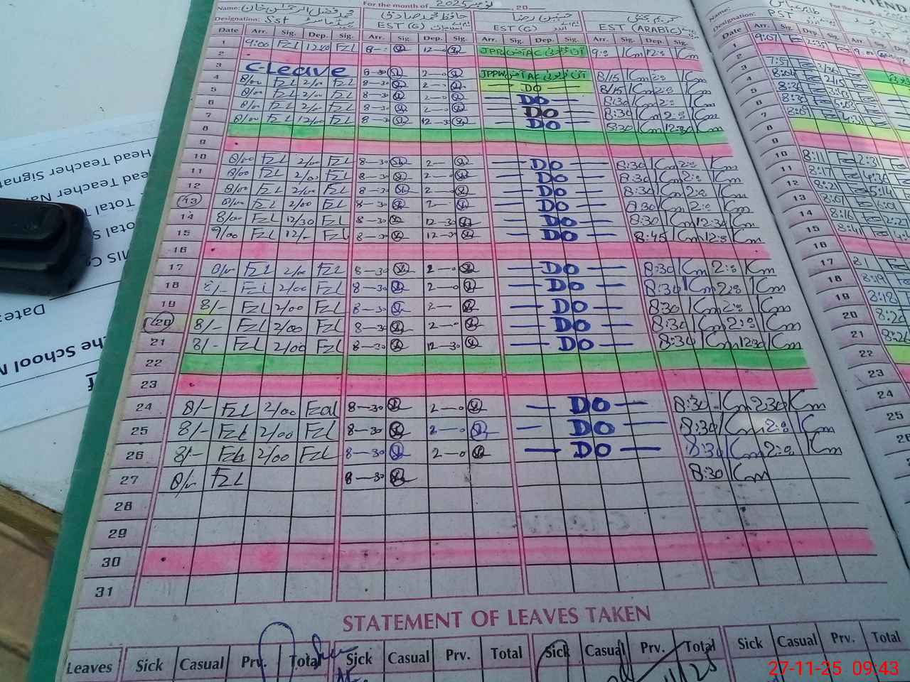 | CNIC | Full Name | Designation | R/C | Absence During Last Calender Month |
