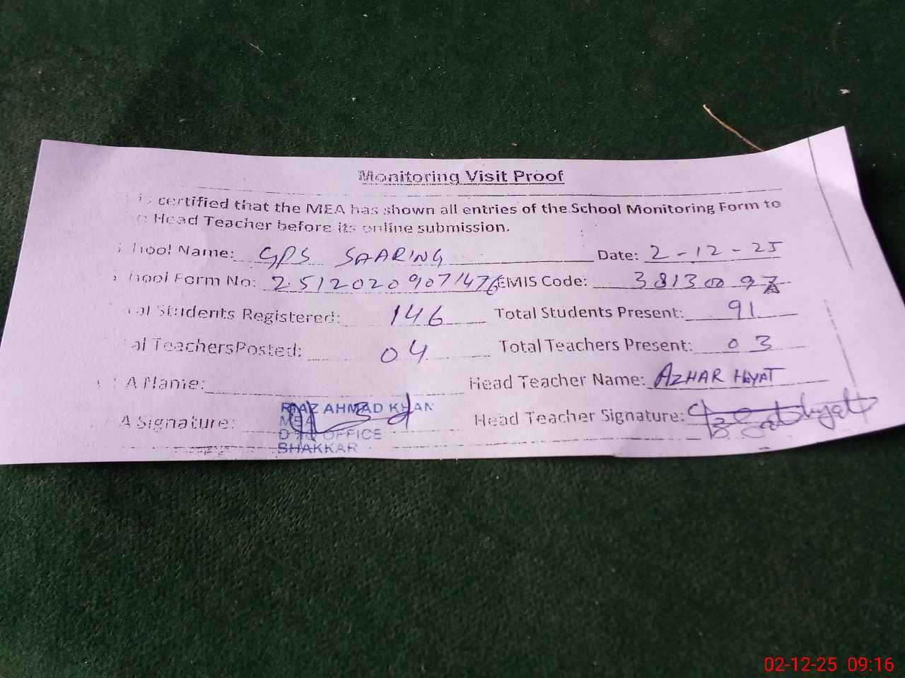 | Attendance Register | Head Teacher | MEA with School | Visit Proof |