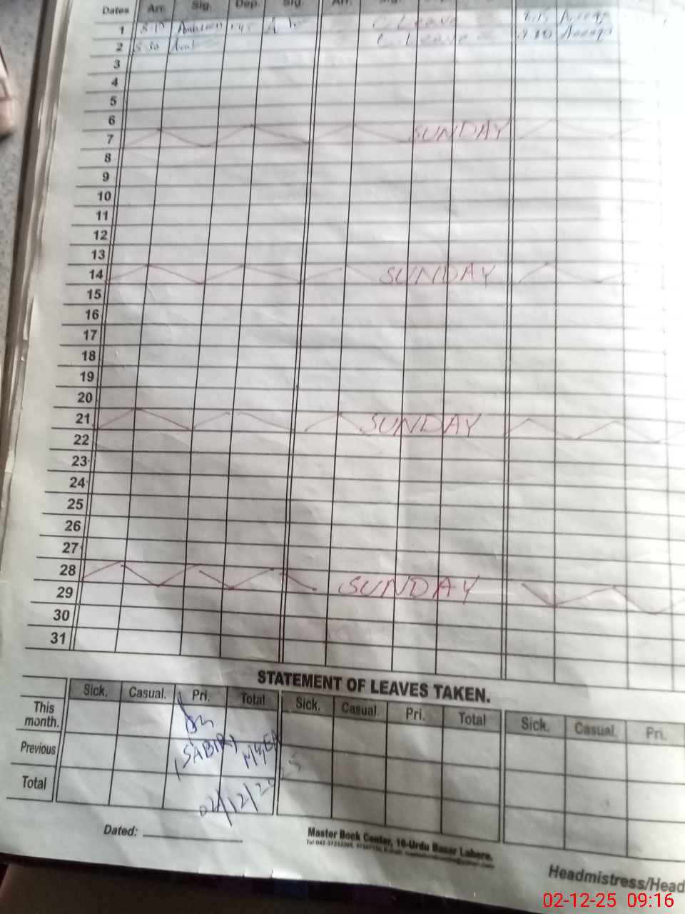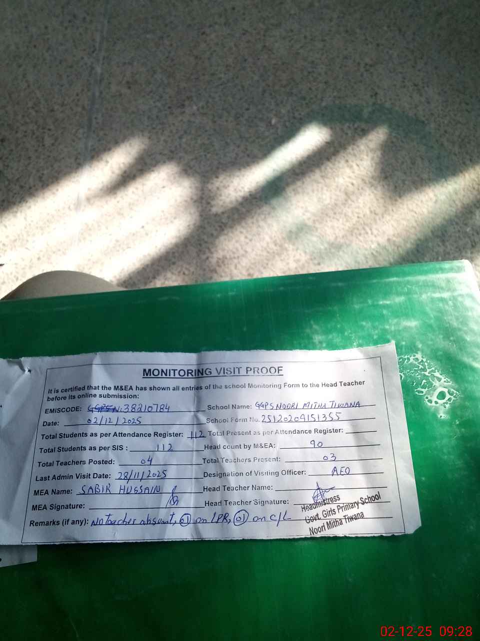| Remarks (Use Separate Page if Required): no teacher absent total students 112 present students 90 last admin visit by AEO on 28 Nov 2025 | |||||