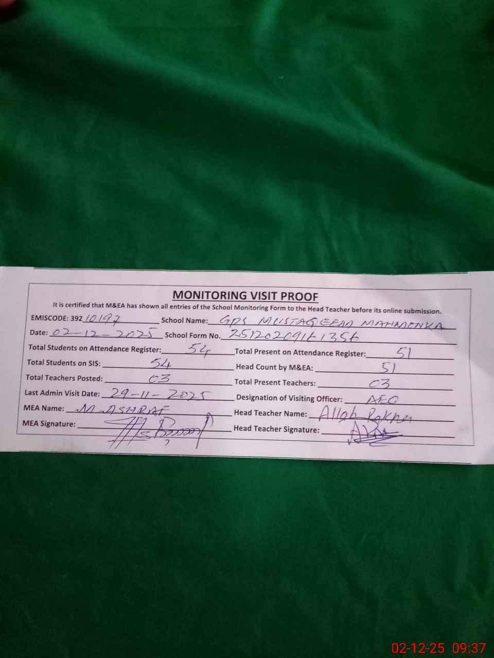 | Attendance Register | Head Teacher | MEA with School | Visit Proof |