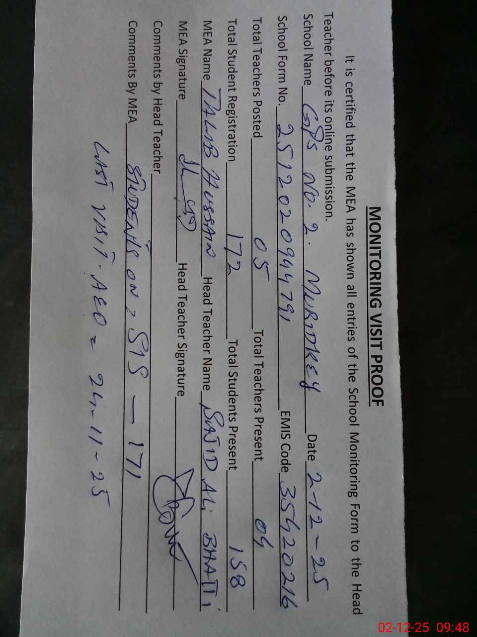 | Attendance Register | Head Teacher | MEA with School | Visit Proof |