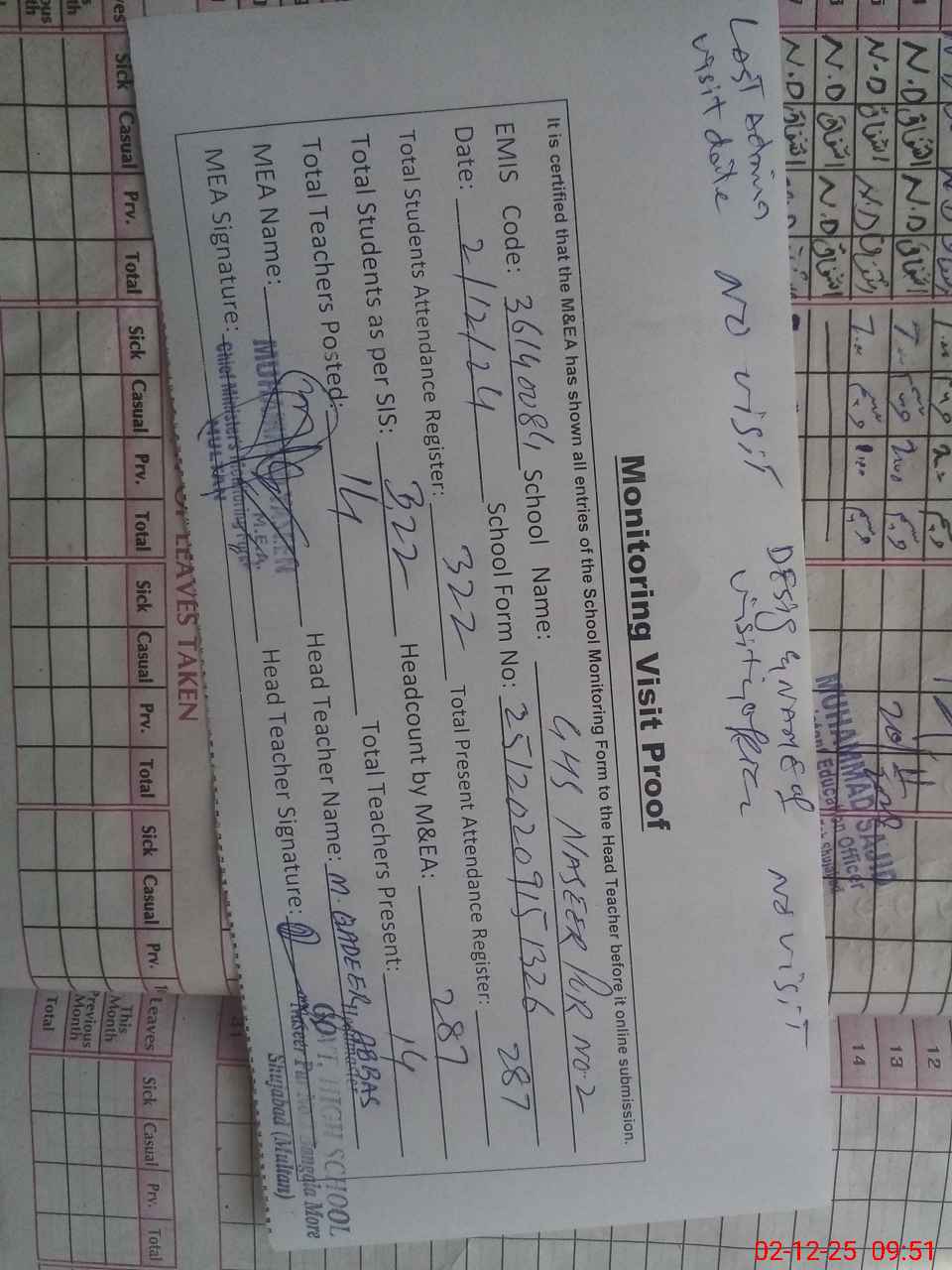 | EMIS Code: 36120084 | Name of School: GHS NASEER PUR NO.2 SHUJABAD | |||