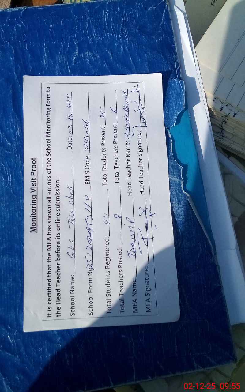 | Attendance Register | Head Teacher | MEA with School | Visit Proof |
