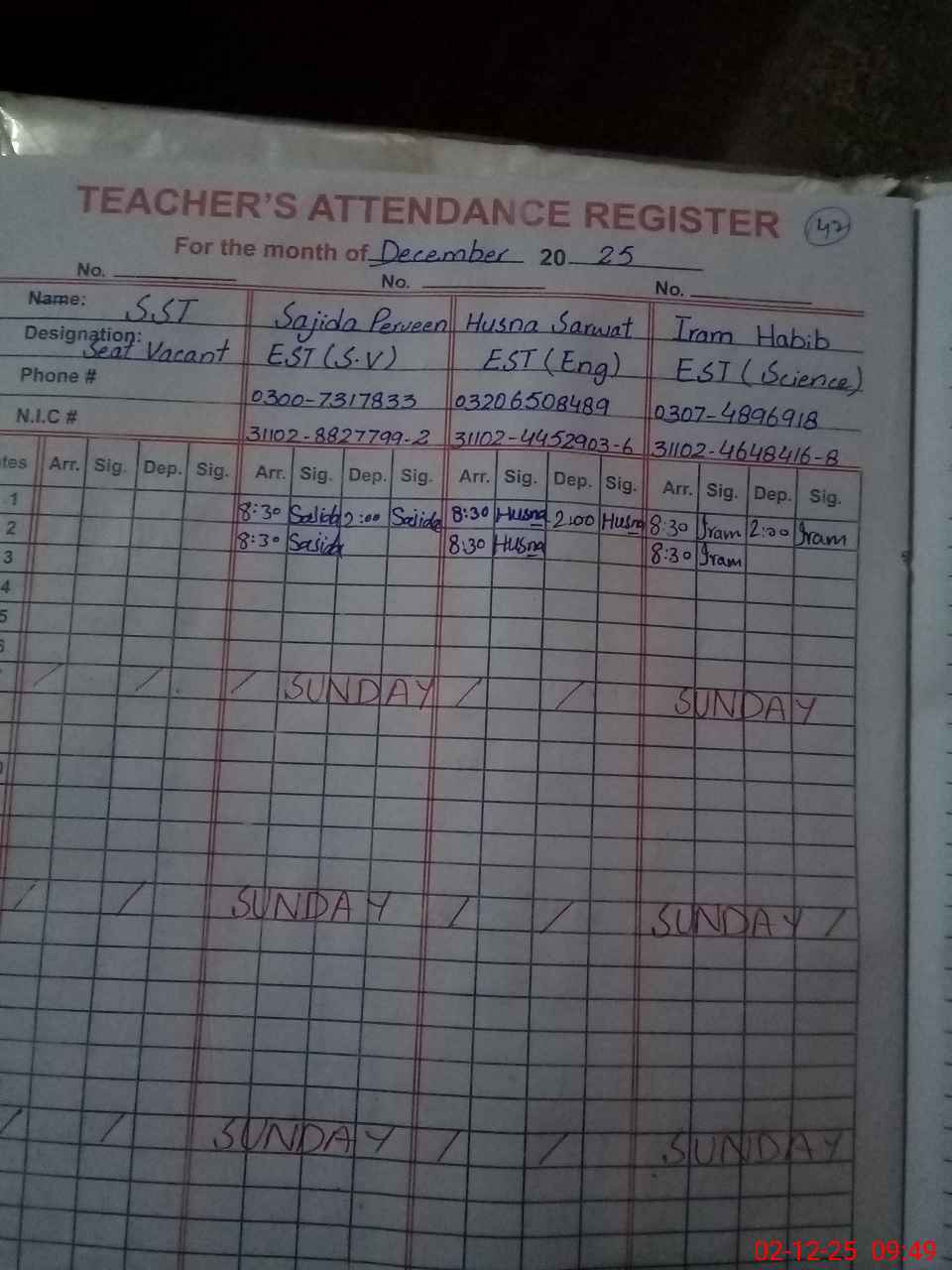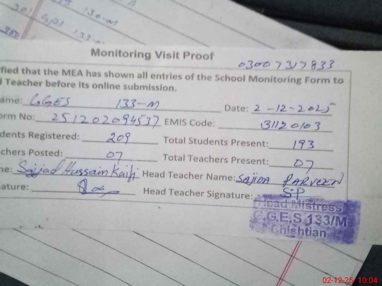 | Name: Sa**** Pa**** Designation: (School Headmaster's/Headmistress's) EST Phone/Cell Number: 03**** |