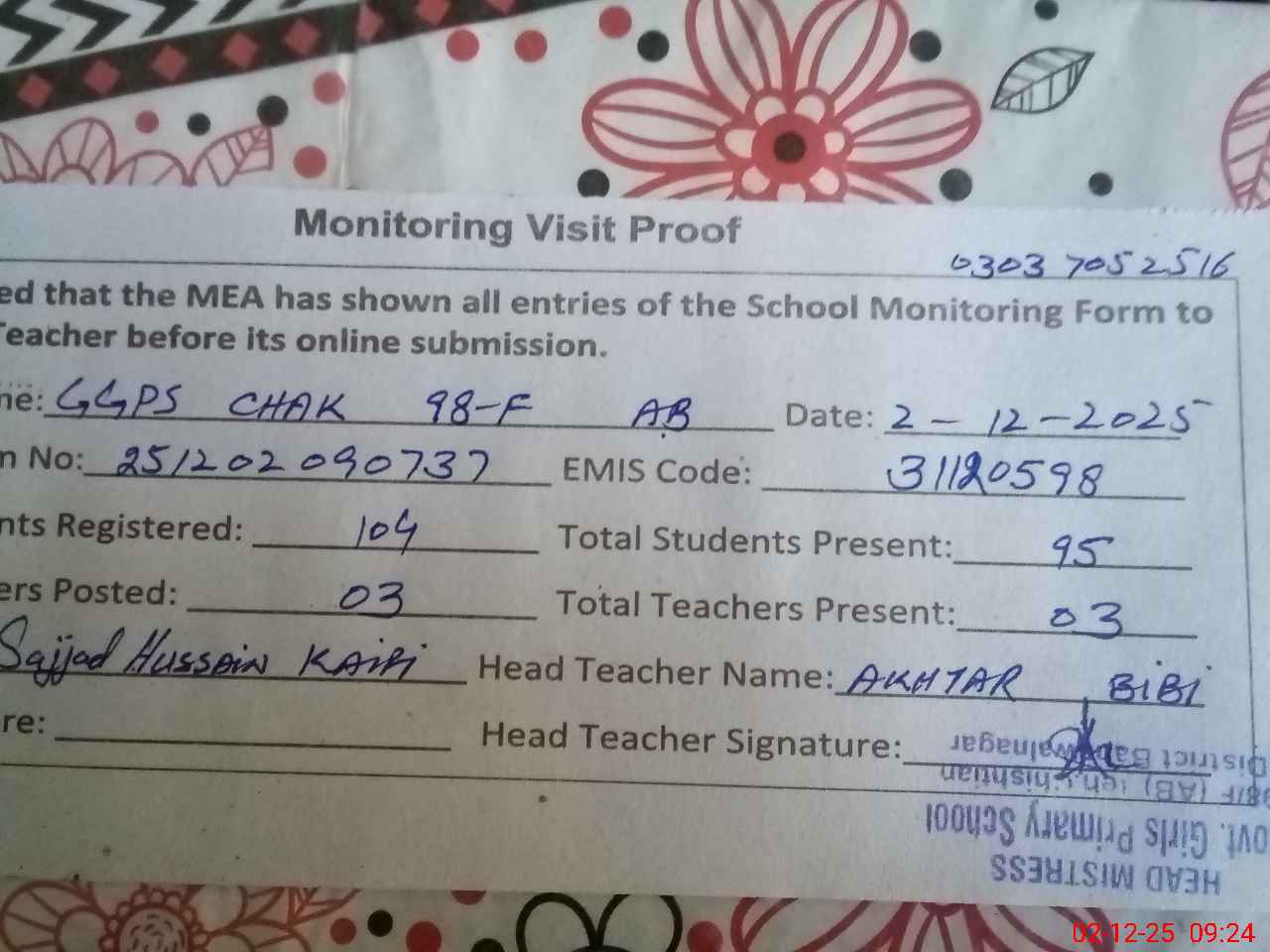| Name: AK**** BI**** Designation: (School Headmaster's/Headmistress's) EST Phone/Cell Number: 03**** |