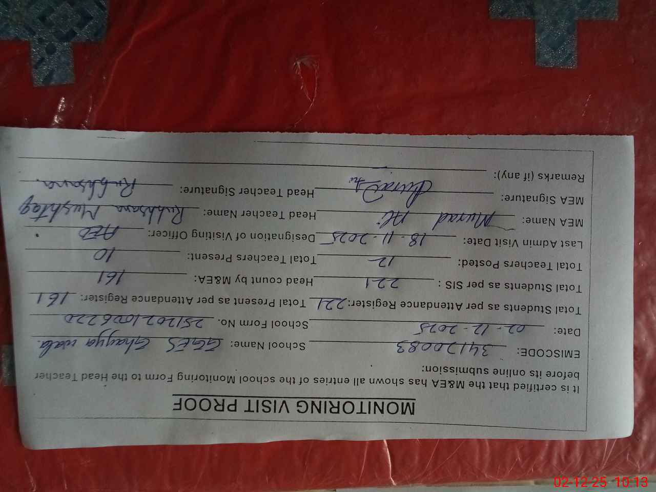 | Attendance Register | Head Teacher | MEA with School | Visit Proof |
