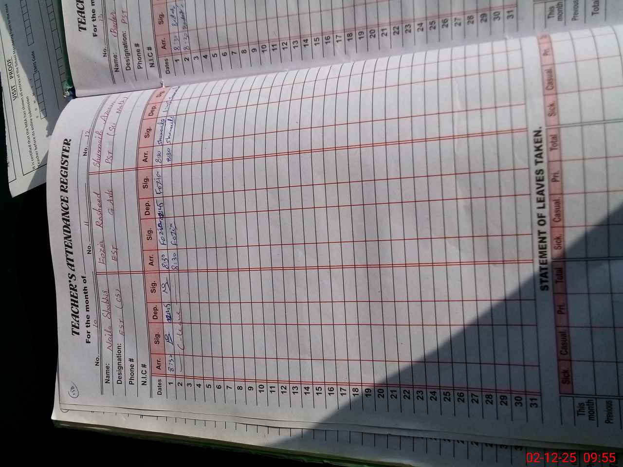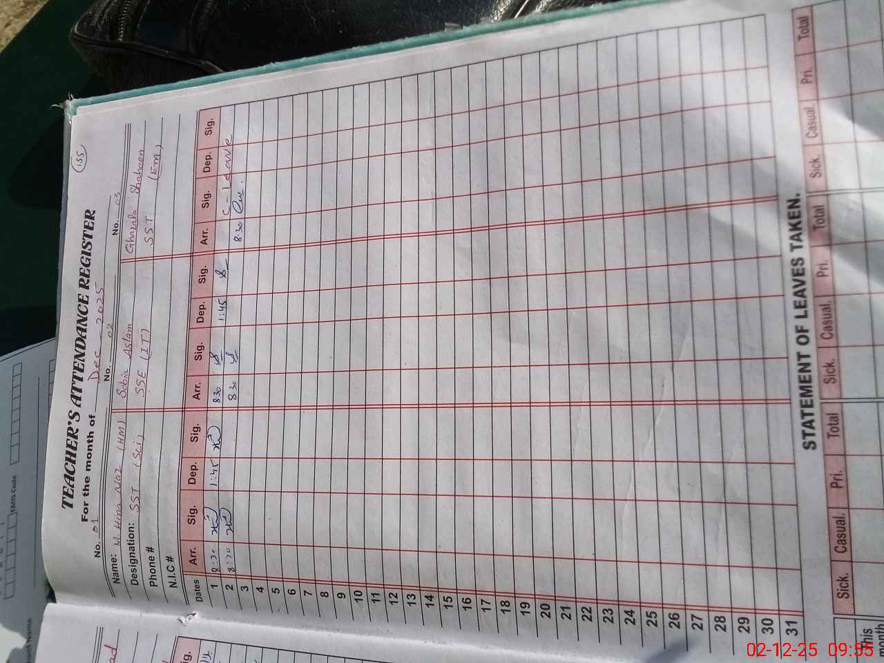 | CNIC | Full Name | Designation | R/C | Absence During Last Calender Month |
