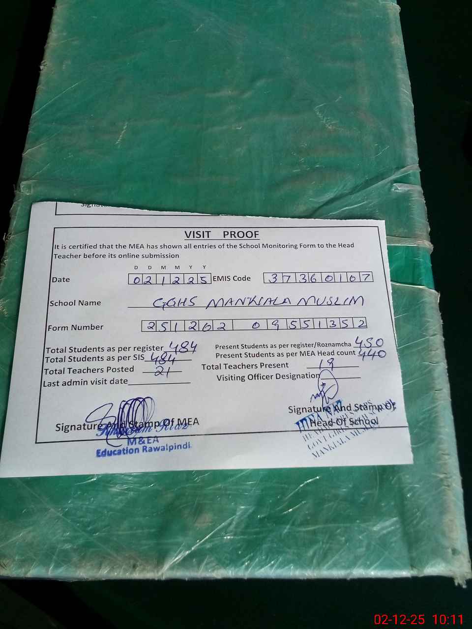 | Certified that this School was Inspected by the Undersigned MEA/DMO Today and the Information Stated Above is as Per Record. | |||||