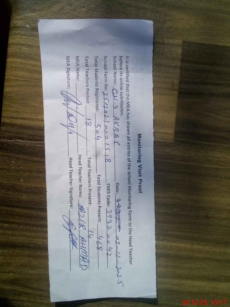 | Attendance Register | Head Teacher | MEA with School | Visit Proof |