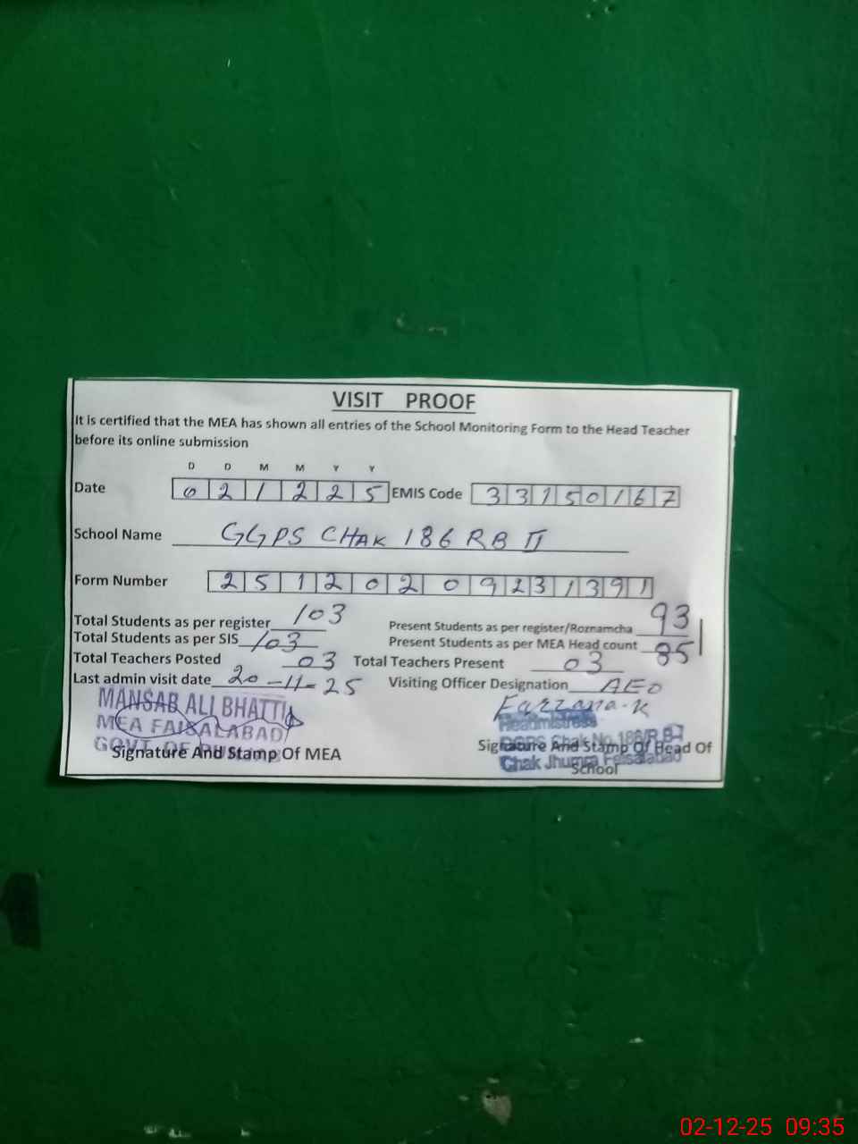 | Attendance Register | Head Teacher | MEA with School | Visit Proof |
