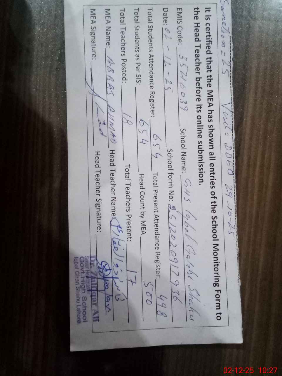 | EMIS Code: 35210039 | Name of School: GHS IQBAL GARHI SHAHU | |||