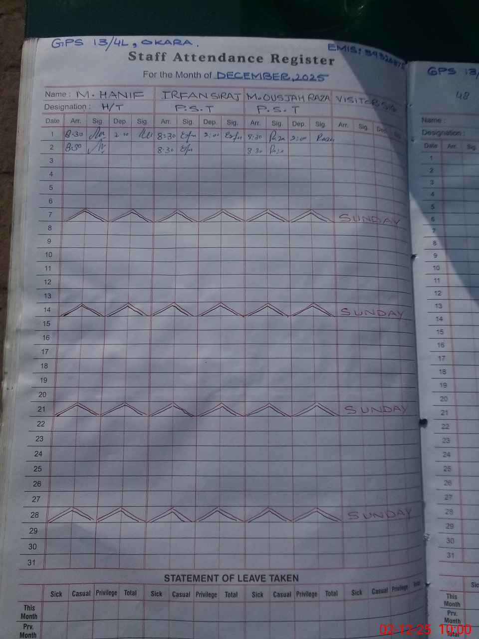 | CNIC | Full Name | Designation | R/C | Absence During Last Calender Month |