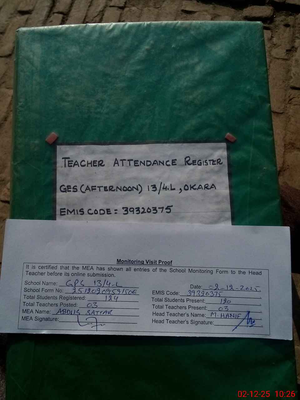 | Attendance Register | Head Teacher | MEA with School | Visit Proof |