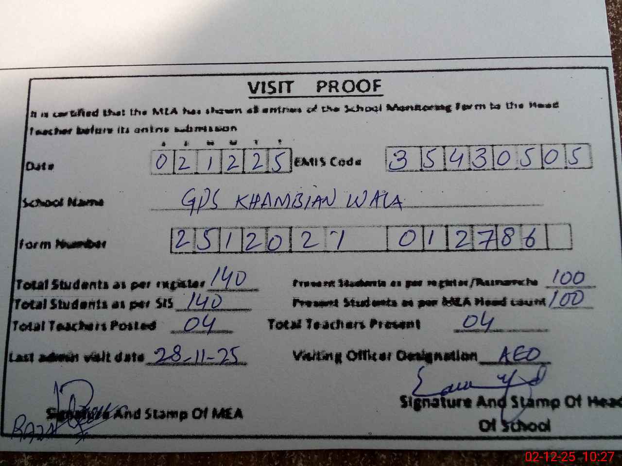 | EMIS Code: 35430505 | Name of School: GPS KHAMBIAN WALA | |||