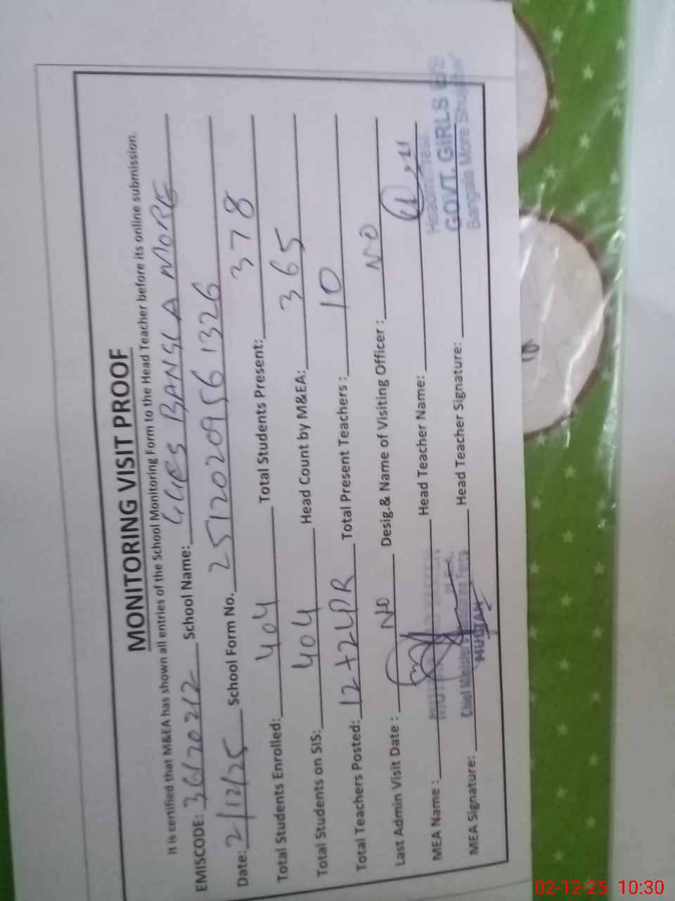 | Attendance Register | Head Teacher | MEA with School | Visit Proof |
