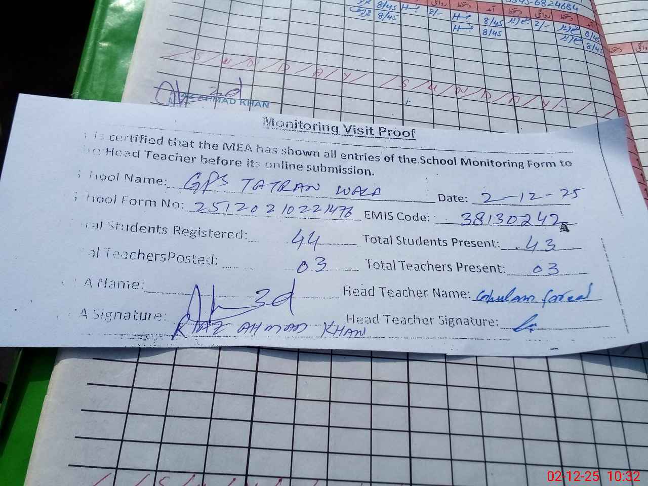 | Attendance Register | Head Teacher | MEA with School | Visit Proof |