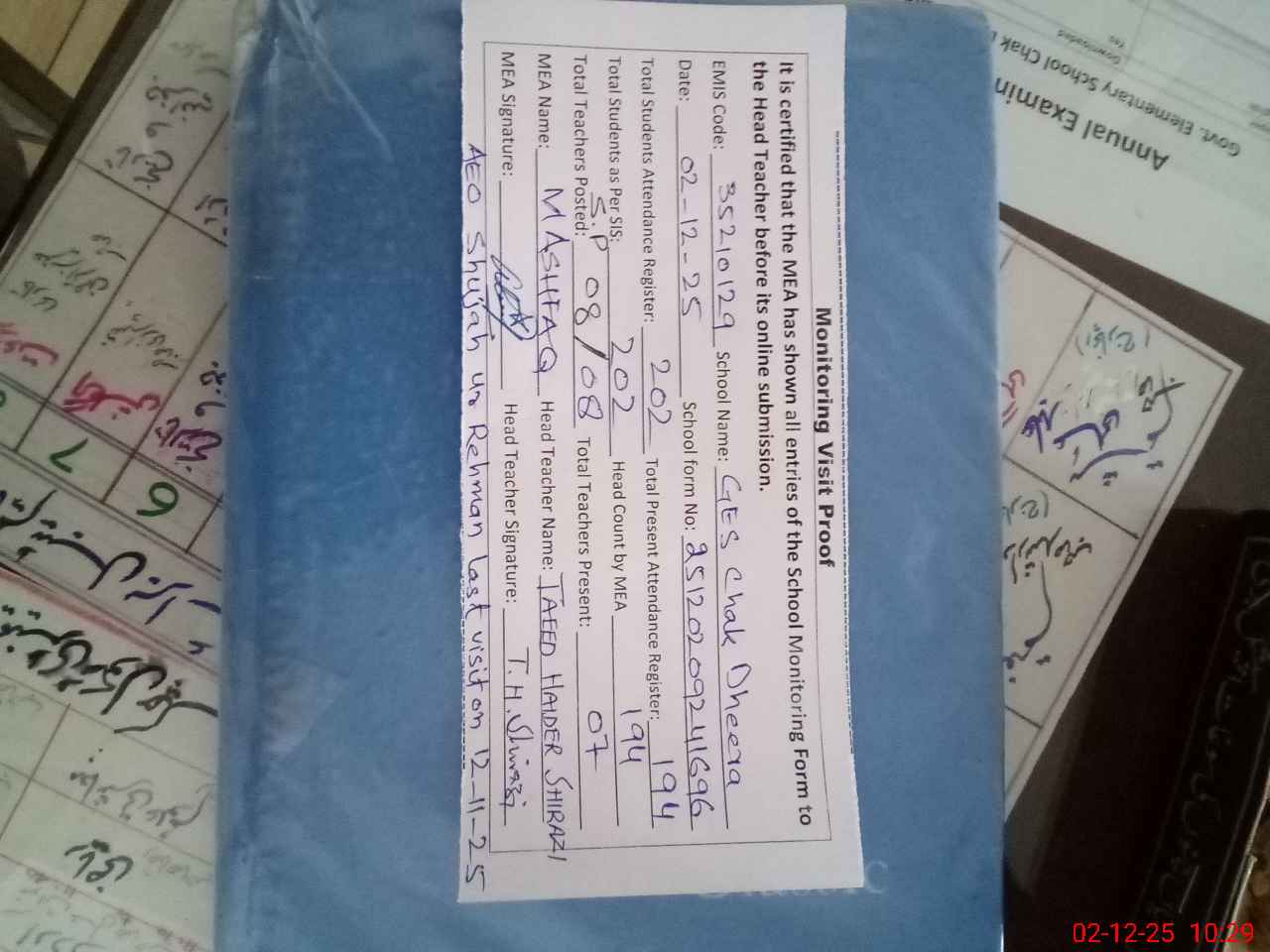 | Remarks (Use Separate Page if Required): Last visit of AEO Shujah ur Rahman on 12-11-25 Teachers Sanctioned Post 08 and Filled 08 35210129 | |||||