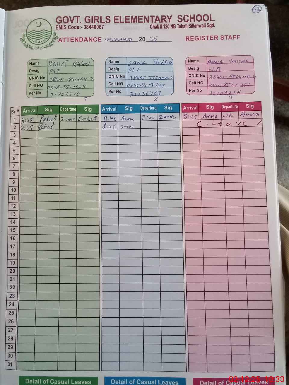 | CNIC | Full Name | Designation | R/C | Absence during last cal. month |