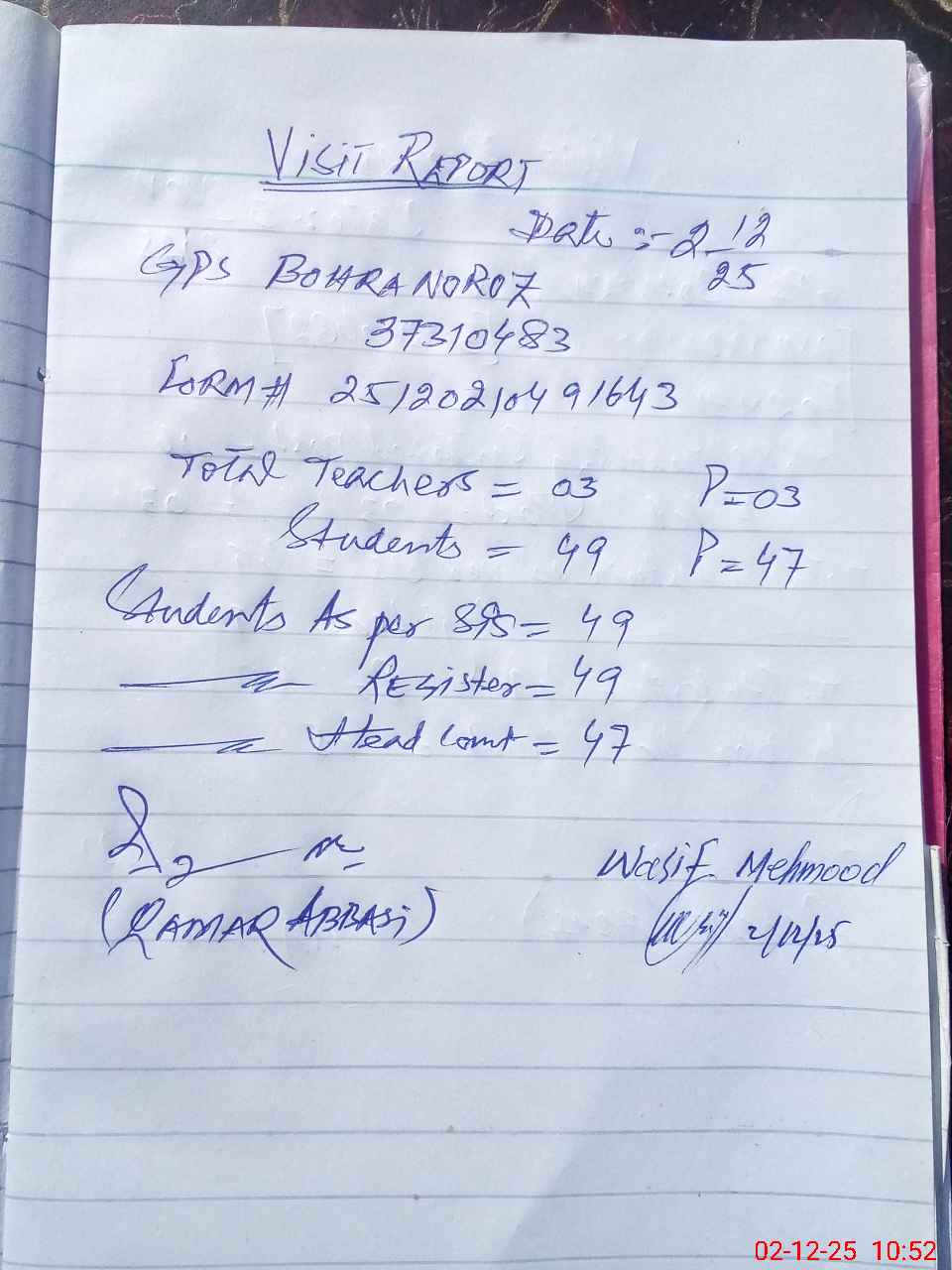 | Attendance Register | Head Teacher | MEA with School | Visit Proof |