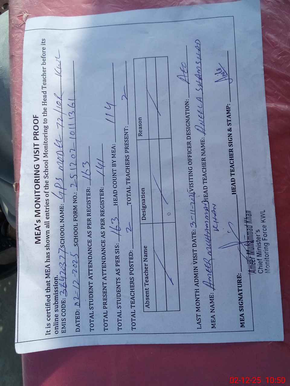 | Attendance Register | Head Teacher | MEA with School | Visit Proof |
