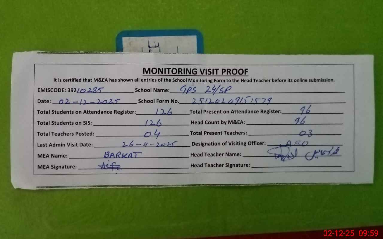 | EMIS Code: 39210285 | Name of School: GPS CHAK NO. 24/SP | |||