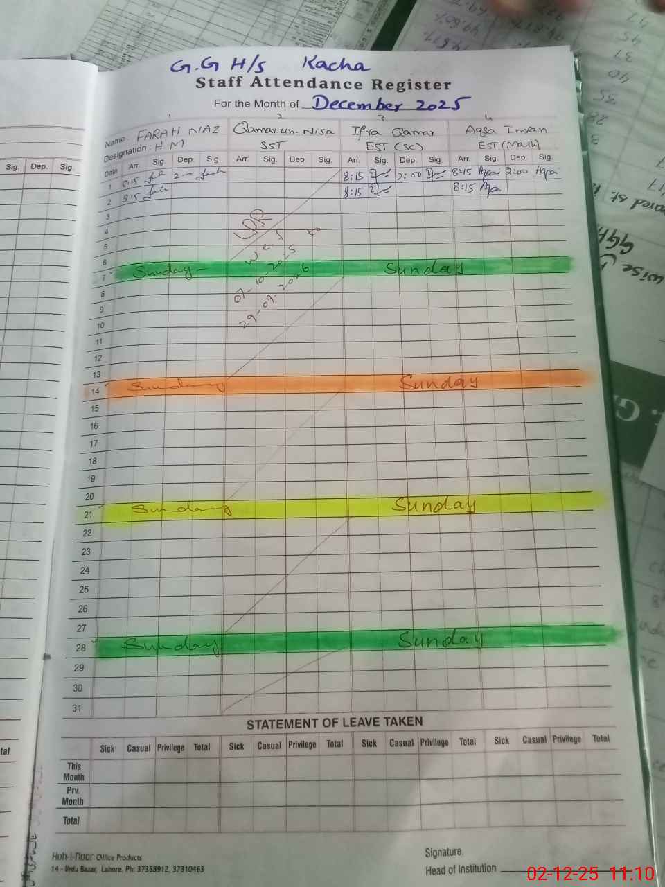 | CNIC | Full Name | Designation | R/C | Absence During Last Calender Month |