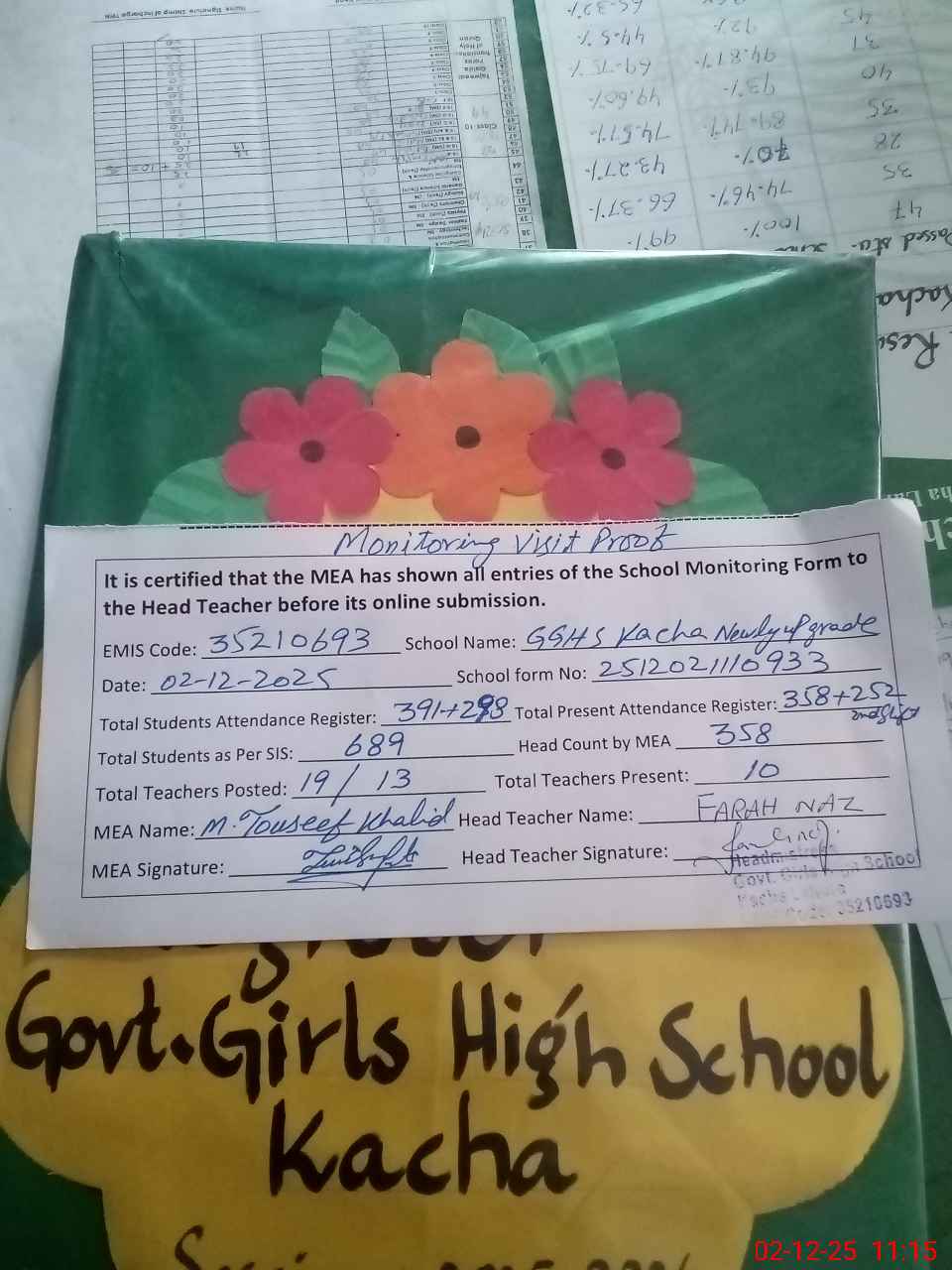 | Attendance Register | Head Teacher | MEA with School | Visit Proof |