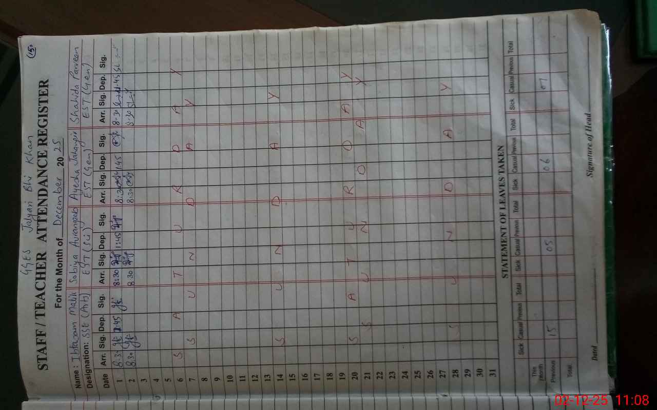 | Remarks (Use Separate Page if Required): miss Farah Khalid Pst Absent from her duty since Aug 2024 still matter in pending no visit of Aeo or any other authority recorded in log book after 23 oct 2025 | |||||