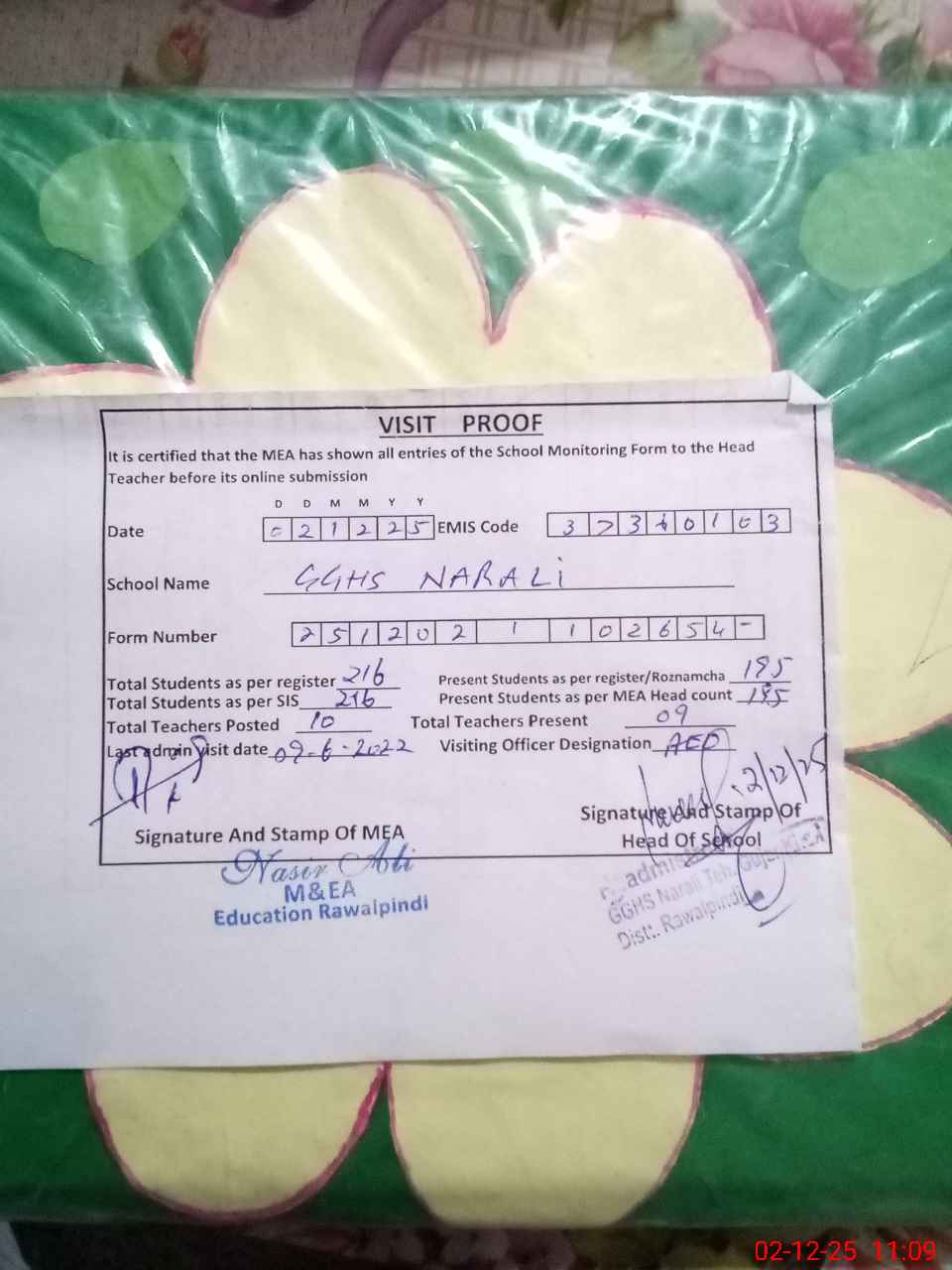 | Certified that this School was Inspected by the Undersigned MEA/DMO Today and the Information Stated Above is as Per Record. | |||||