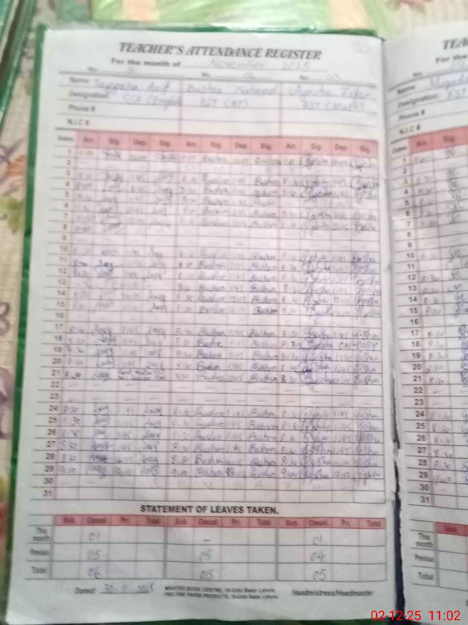| CNIC | Full Name | Designation | R/C | Absence During Last Calender Month |