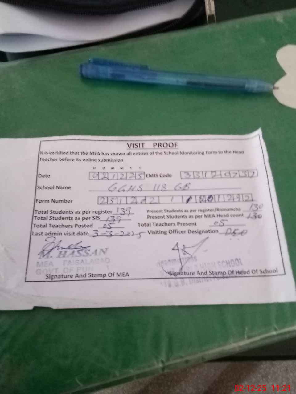 | Attendance Register | Head Teacher | MEA with School | Visit Proof |