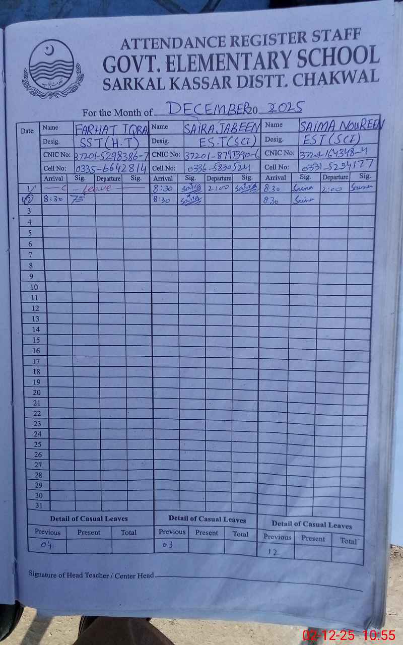 | CNIC | Full Name | Designation | R/C | Absence During Last Calender Month |