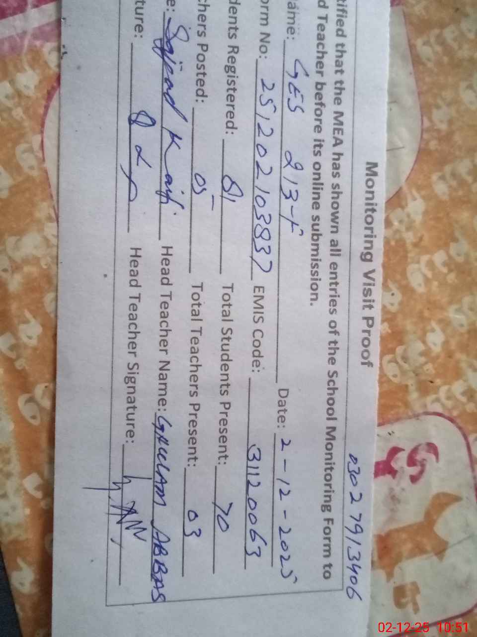 | Name: GH**** AB**** Designation: (School Headmaster's/Headmistress's) SST GENERAL Phone/Cell Number: 03**** |