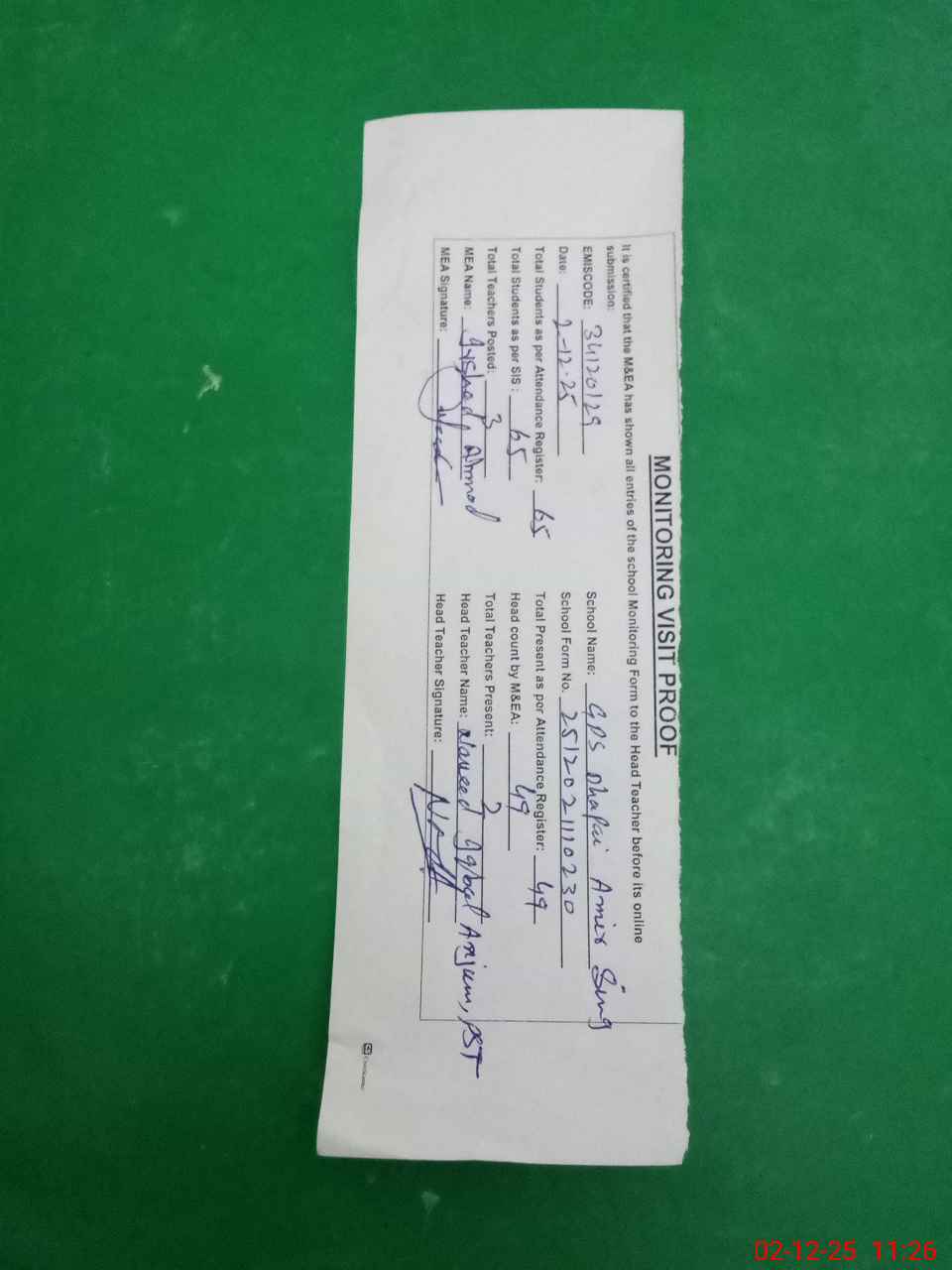| Attendance Register | Head Teacher | MEA with School | Visit Proof |