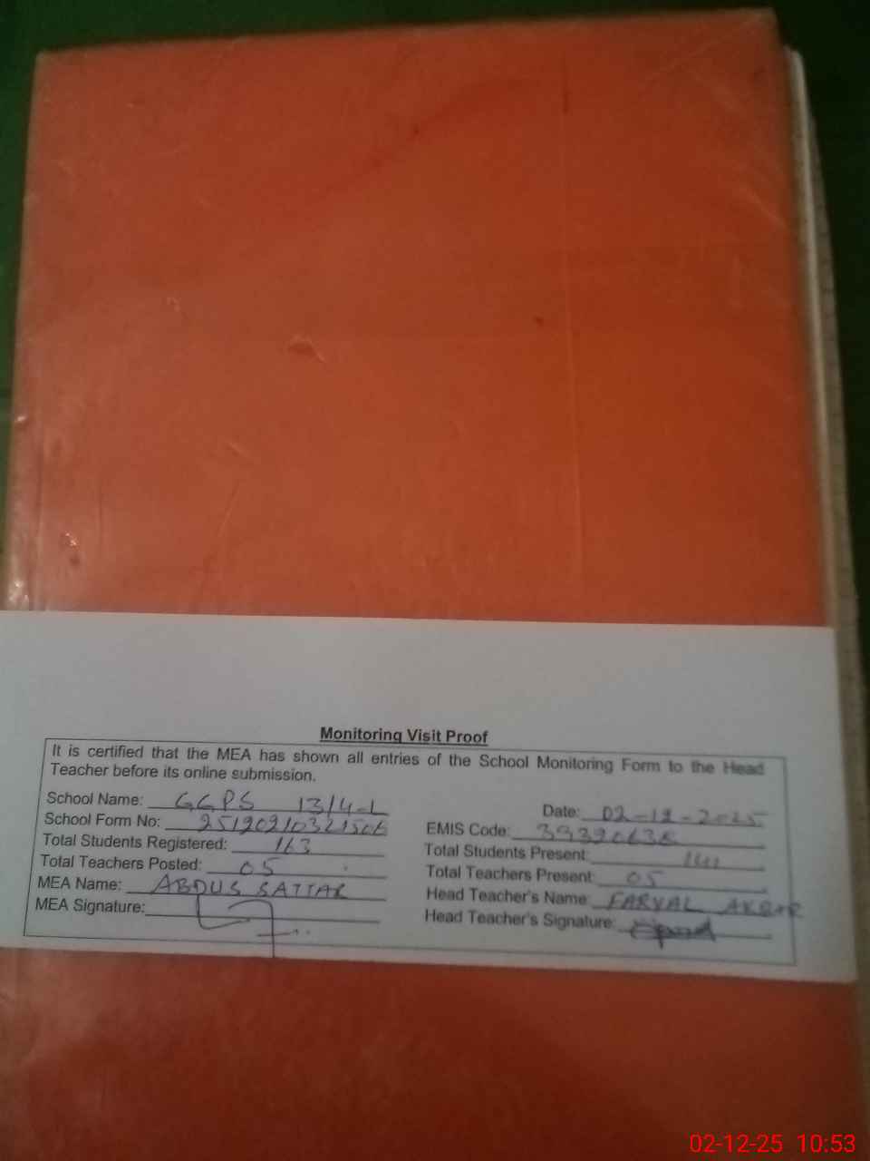 | Attendance Register | Head Teacher | MEA with School | Visit Proof |